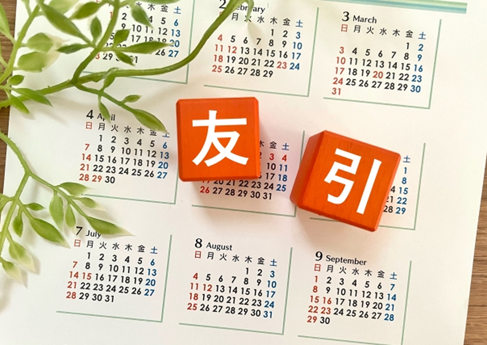 友引は六曜の一つです。もともとは「共に引き分ける」の意が強く、勝敗がつきにくい日の意味合いでした。のちに「友を引く」との受け止めが広まり、弔い事では避ける方もいます。